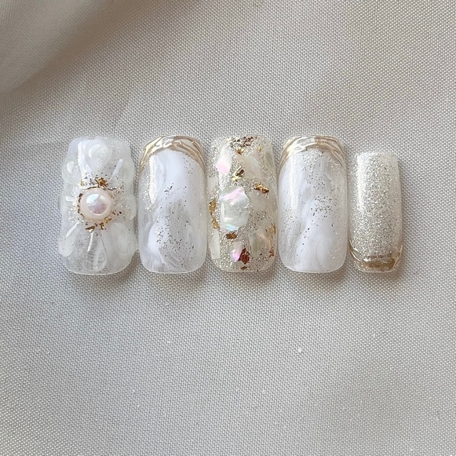白×クリアぷっくりフラワーネイル 白 シェル キラキラ ゴールドミラー ブライダル 結婚式 白ドレス 成人式 春夏秋冬