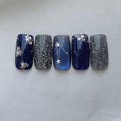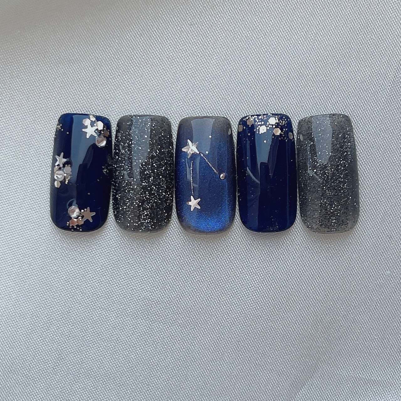 ネイビー濃紺の大人っぽ夜空ネイルチップ 星空 七夕 フラッシュ マグネット 星座 普段使い 青