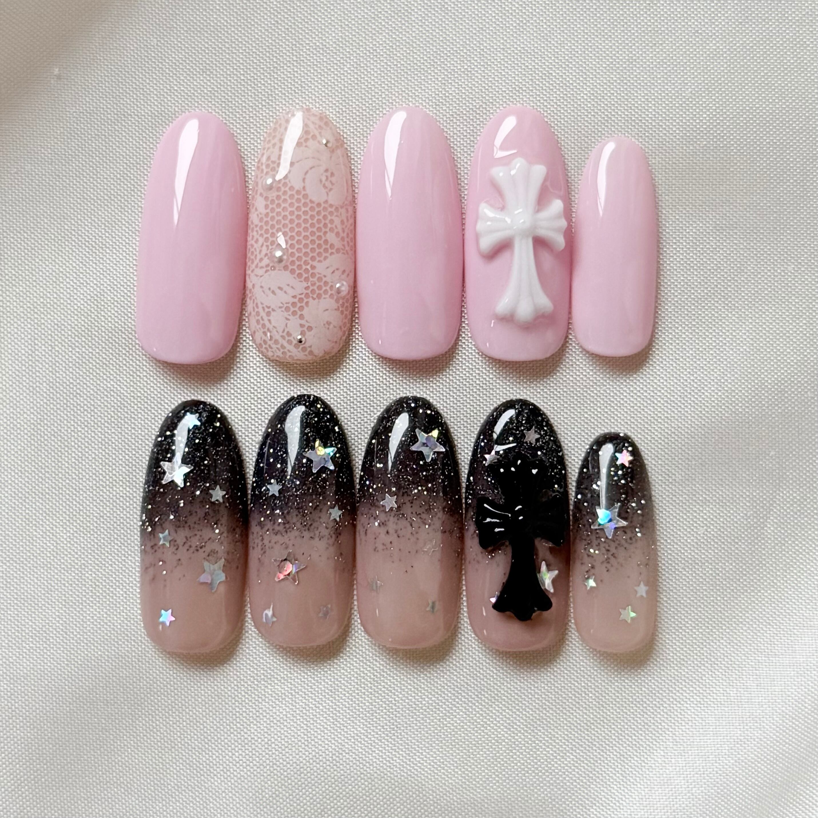 話題のクロスネイル2種★カラー変更可能 レースネイル ピンク パール 黒 フラッシュ グラデ クロム 可愛い 綺麗 推し活