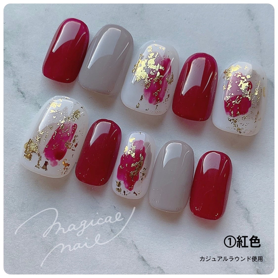 ボルドー×グレー 大人可愛いネイルチップ 塗りかけネイル 金箔 成人式 結婚式 和風 ニュアンス きれい ブルー オレンジ グリーン 黒 ブラック