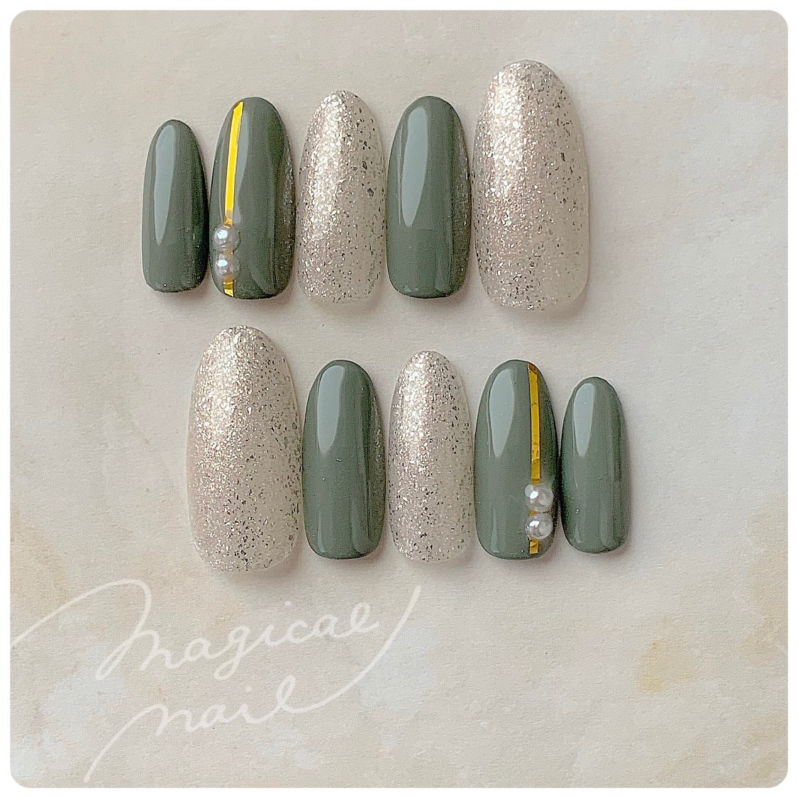 ◇カーキ◇秋冬 パール シルバー ネイルチップ シンプル 上品 緑 グリーン 抹茶 ゴールド