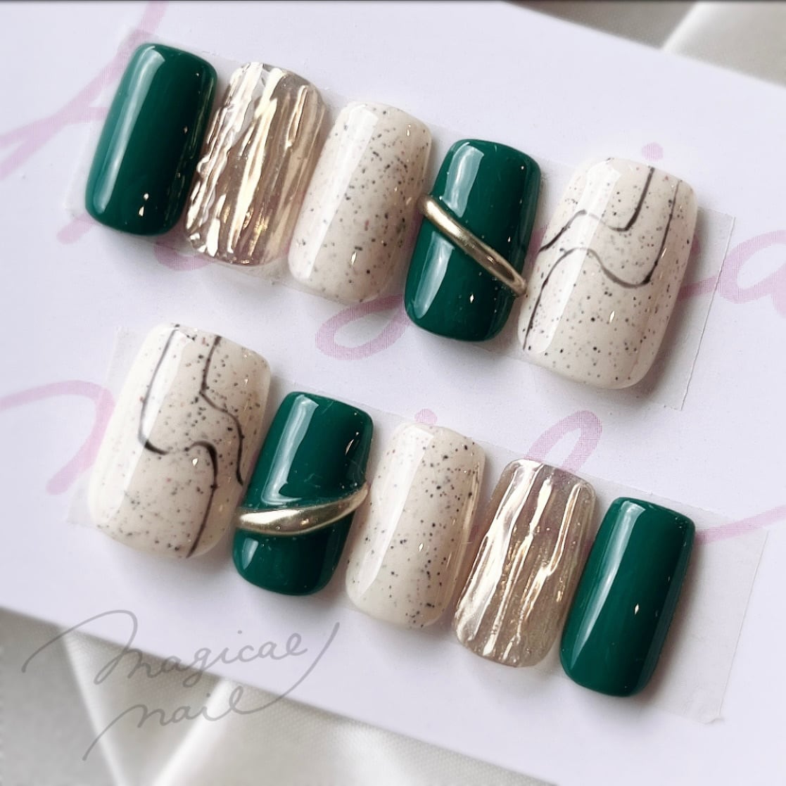緑×リングネイル ゴールドミラー ネイルチップ 普段使い グリーン 深緑 ビビッド つぶつぶ ストーン うねうねミラー