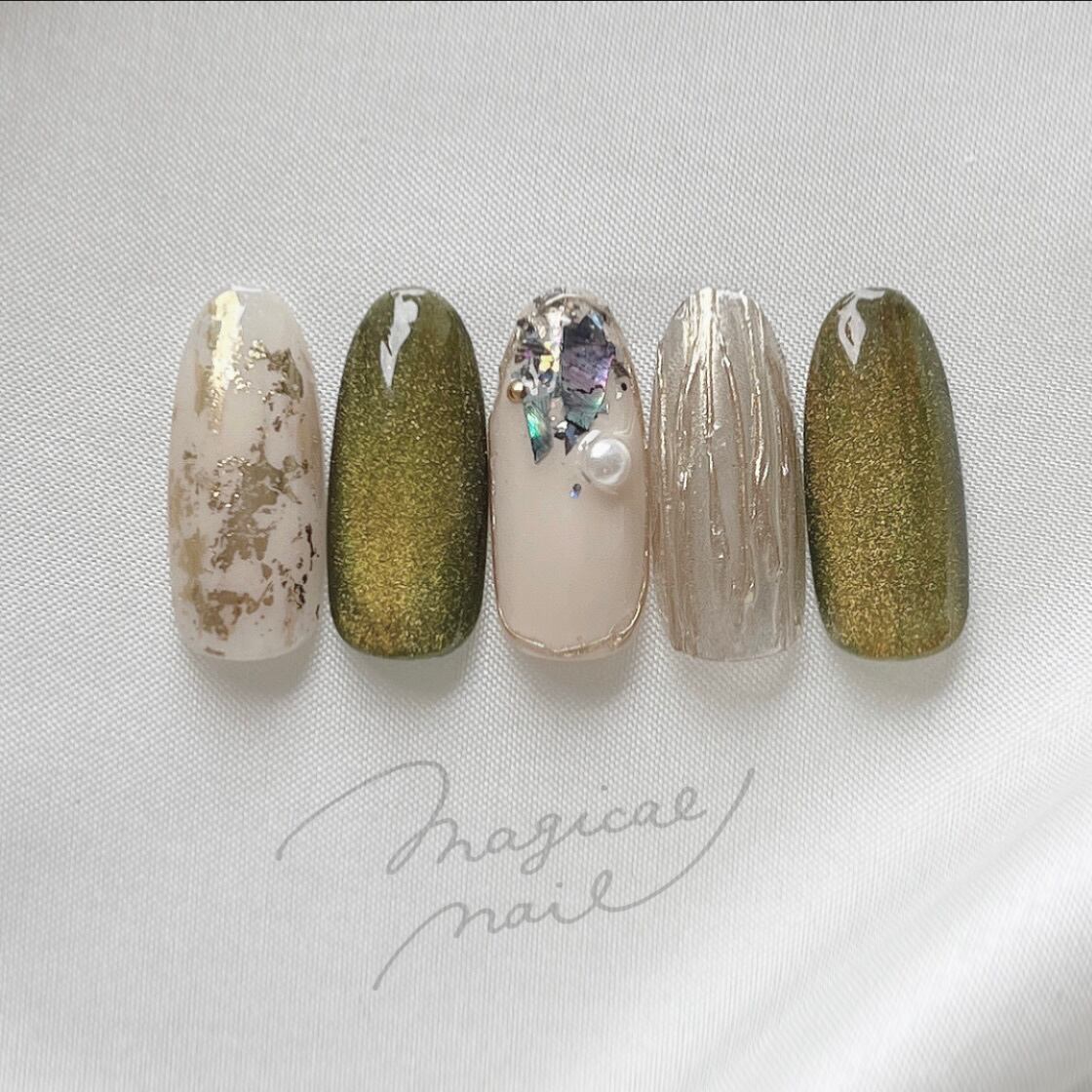 玉虫マグネットネイル タマムシ グリーン 大人きれい 上品 普段使い うねうねゴールドミラー シェル 緑 白