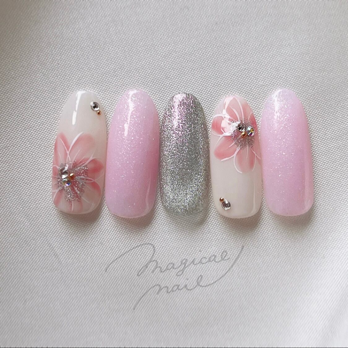手描きフラワー ピンク マグネットネイル シンプル きれい ブライダル 可愛い